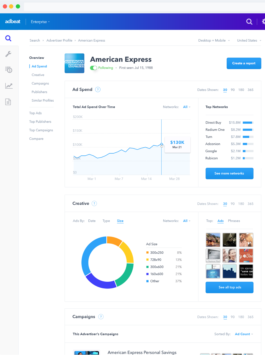 Data Presented in Meaningful Ways — The Adbeat platform is made up of thoughtfully designed dashboards and panels that allow you to make sense of the staggering amount of advertising data we collect. Our innovative dashboard system allows you to view, sort and filter data in ways that will provide the most valuable insights for your media strategy.